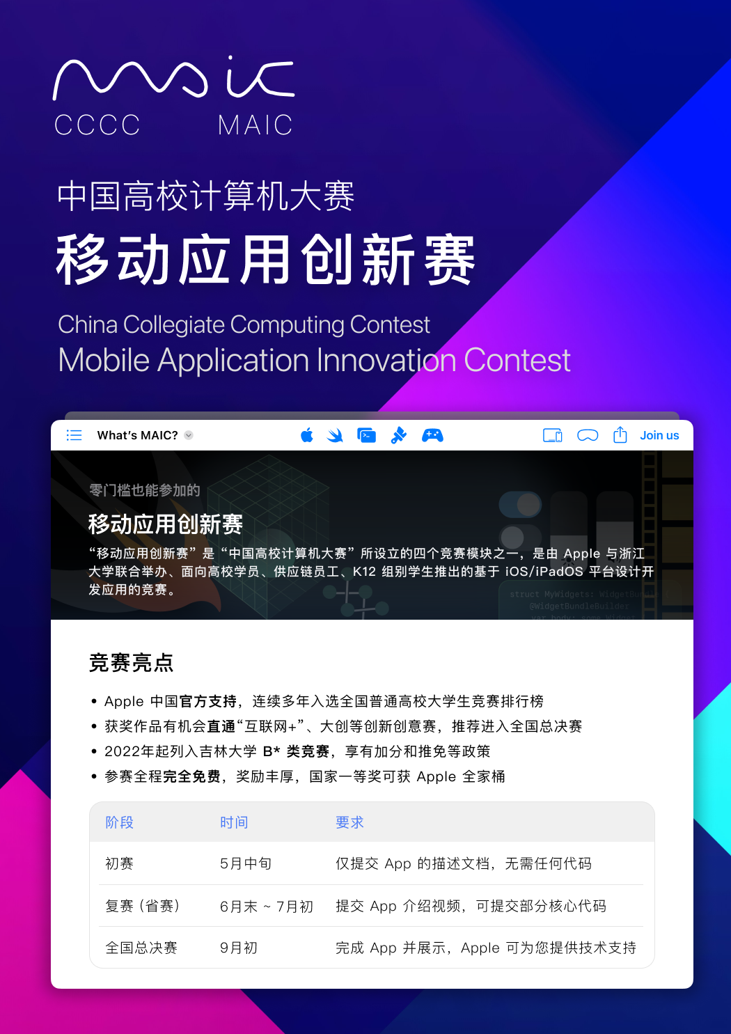 - 参赛全程完全免费,奖励丰厚,国家一等奖可获 Apple 全家桶