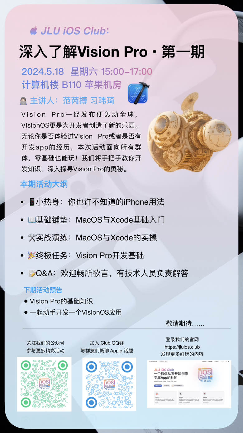 - 活动中有机会体验到 Vision Pro,并获得 JLU iOS Club 定制好礼!